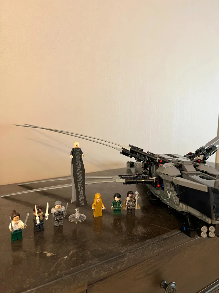 Assemble Your Heroes This Atreides Royal Ornithopter model kit comes with 8 minifigures of your favorite characters. Including Paul Atreides, Lady Jessica, Gurney Halleck, Chani, Duke Leto, and even Baron Harkonnen.