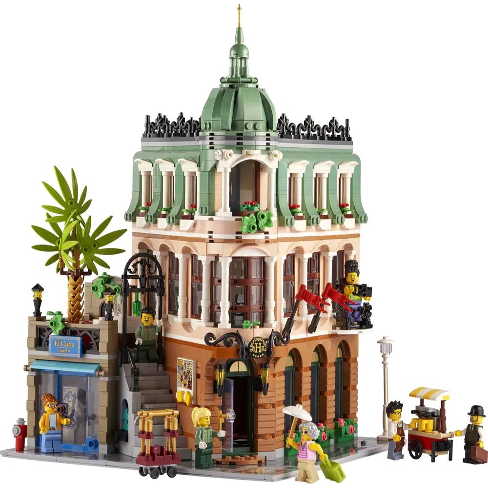 - This set includes 7 unique minifigures, each with their own personality. Its turn-of-the-century corner style is simply stunning. Build guest rooms, a penthouse suite, and a grand lobby. You’ll also assemble a charming terrace, elegant stairs, an art gallery, and a coffee cart!