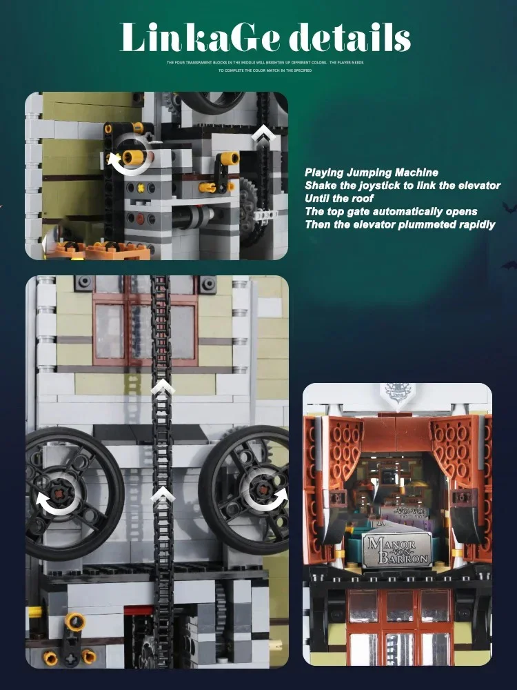 - Thrills and Chills Functionality: Explore the building’s interior by opening the hinged walls. You will discover a fully working free-fall drop ride and automated tower doors. Watch the phantom-infested front gate eerily swing shut!