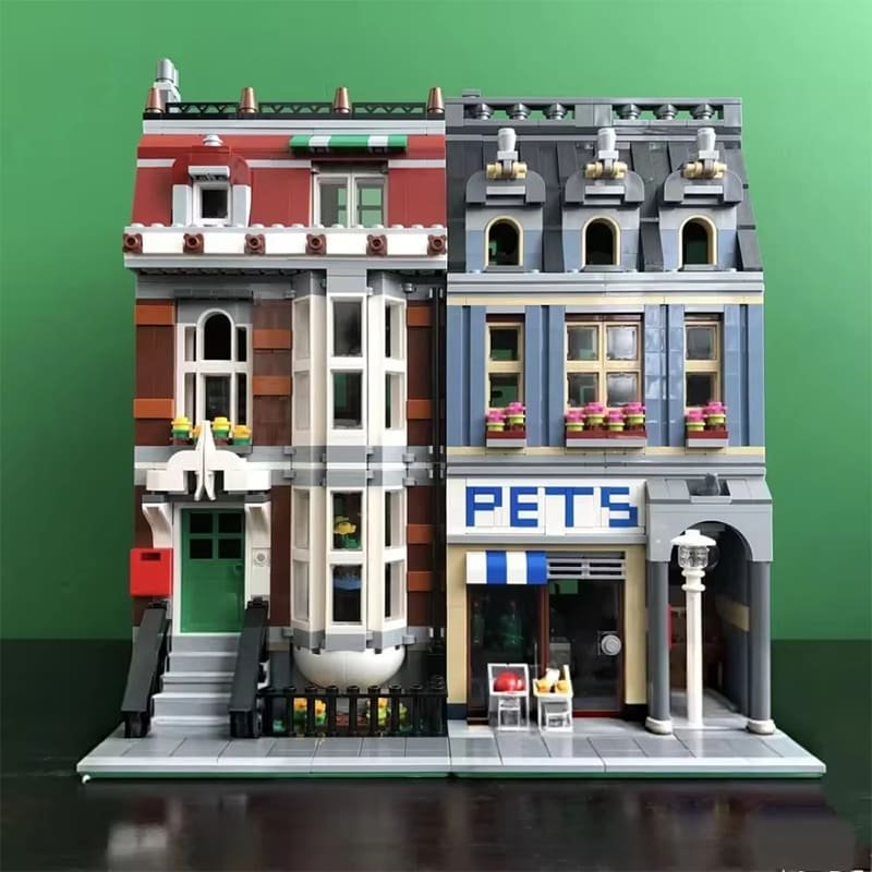 The adjacent townhouse features a detailed ground floor and a spiral staircase. Relax in the roof garden or enjoy the elegant balcony view. This Modular Pet Shop Building Set offers a premium building experience.