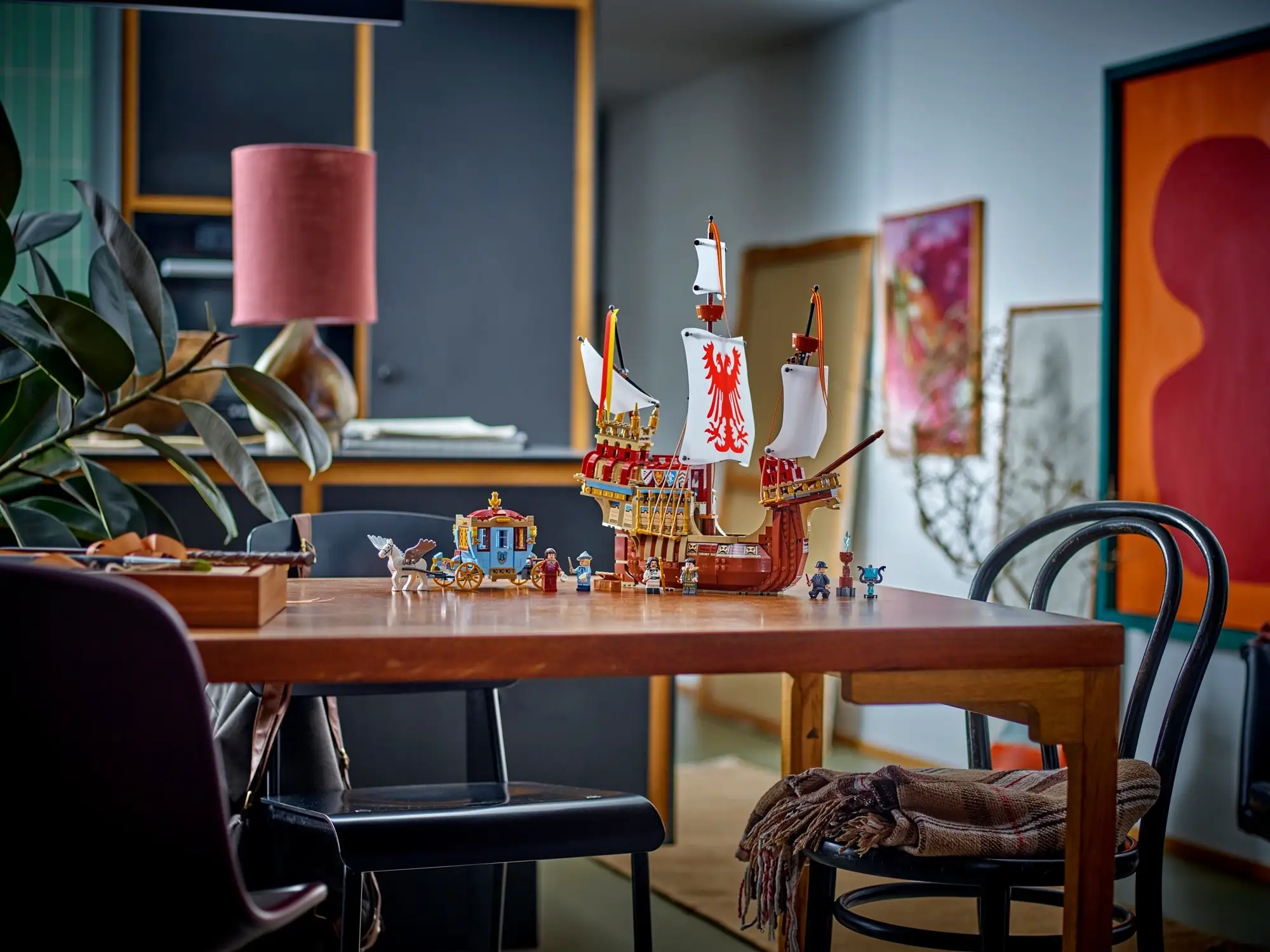 Kids can stage epic scenes with the dark ship that actually floats on water and the golden carriage pulled by a winged horse that really “flies” when moved. Includes 5 champion minifigures and the golden egg.