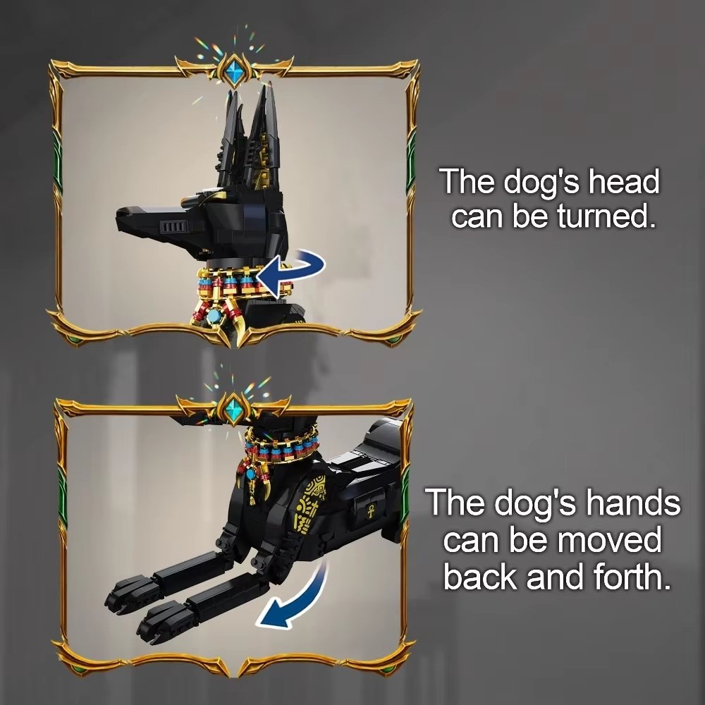 - The clever brick assembly enhances the product’s texture. Its highly restored shape truly brings the mythical creature to life. The dog’s head is rotatable, and its paws can move forward and backward for dynamic posing. This Anubis Dog Building Kit boasts a compact build with precise bricks.
