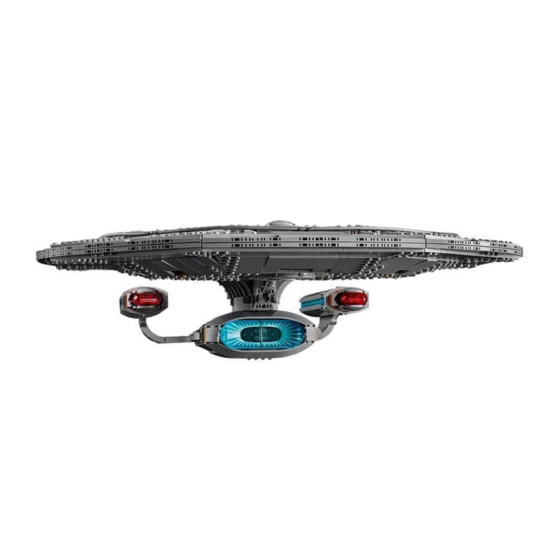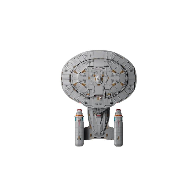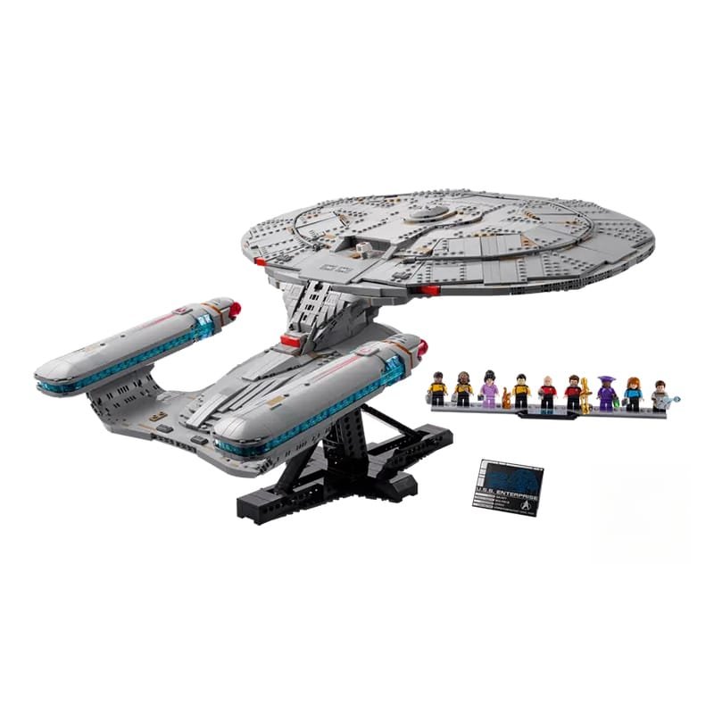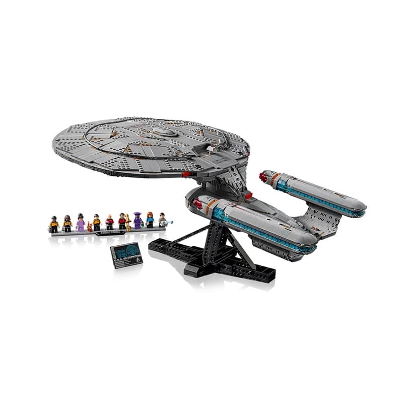 Join the bridge crew with 9 included minifigures like Captain Picard and Data. This Star Trek TNG Model sits on a display stand with a data plaque. It comes with fun accessories including phasers and a cat.