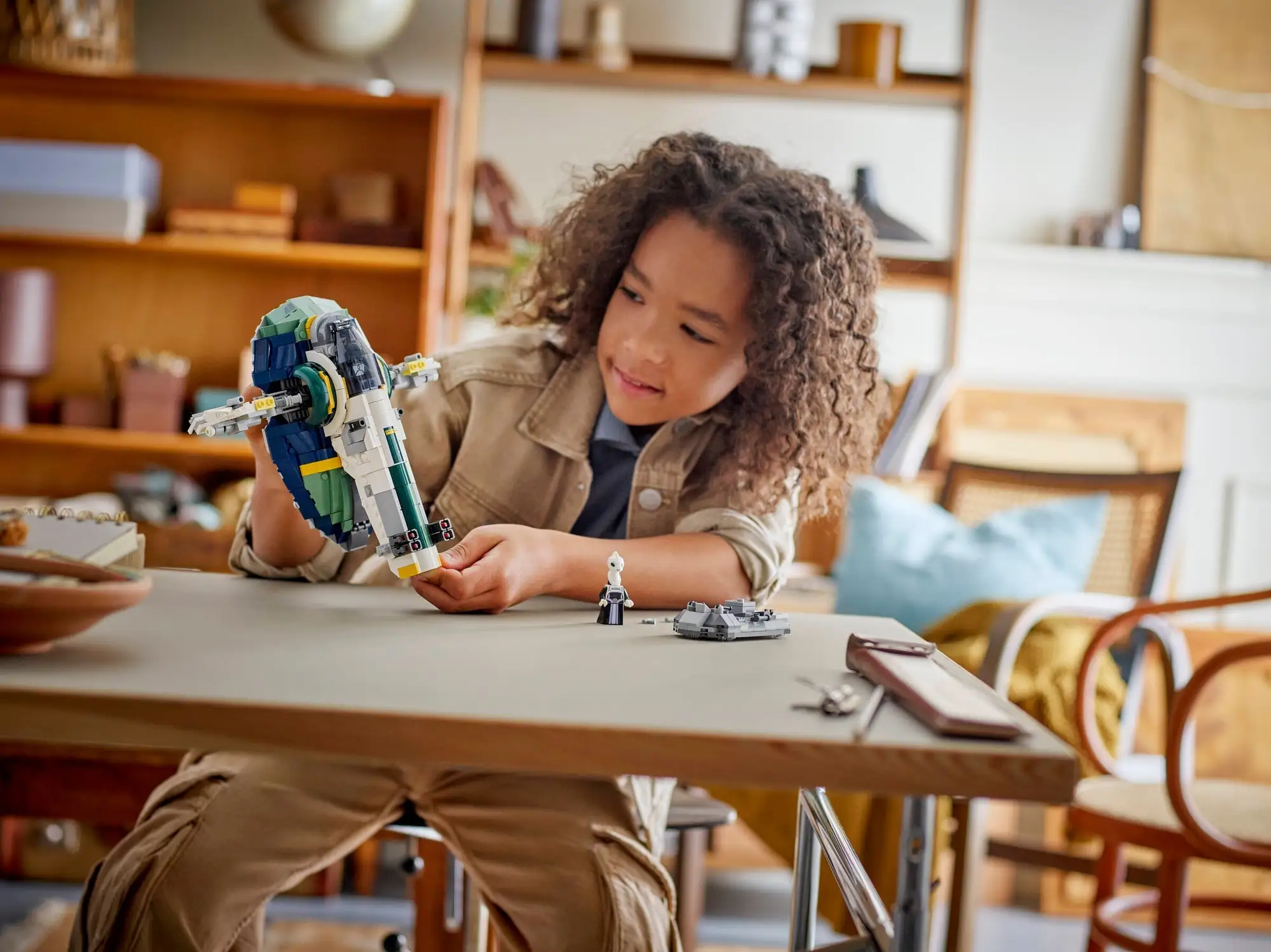 Unleash bounty hunter adventures with this detailed Jango Fett ship building set. Kids recreate epic chase scenes while the wings rotate with gravity and bombs drop from below.